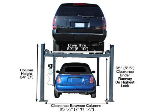 The Atlas® 408SL super deluxe portable vehicle storage lift is designed for those car enthusiasts who demand the absolute best look and superior quality. The 408SL has all the great features of our Atlas® Garage Pro Series 4 post hobbyist lifts, but incorporates many features found only on our Atlas® commercial grade 4-post lifts. All columns incorporate two special bends which help to increase the column strength. These strategic bends also increase the surface area for the slide block to travel. Horizontal cables are “hidden” inside of the cross tubes. Professional grade wheel covers are used to eliminate almost all exposure of cables and the double lock system. The Atlas® 408SL has “more metal” and weighs over 100 lbs. more than other hobbyist lifts based upon the same column and runway configuration.