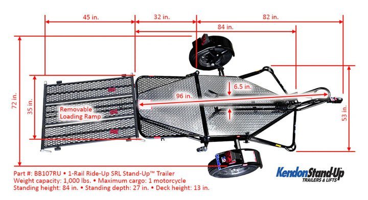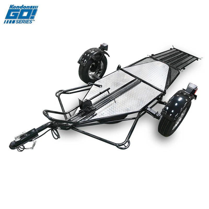 The Go! Series Single-Rail Ride-Up trailer can carry one full-size motorcycle or general cargo. Each trailer is equipped with ride-on capabilities plus Kendon’s renowned Stand-Up™ folding feature. When in storage, the Go! Single-Rail Ride-Up takes up about the same space as a small bedroom dresser or chest of drawers.