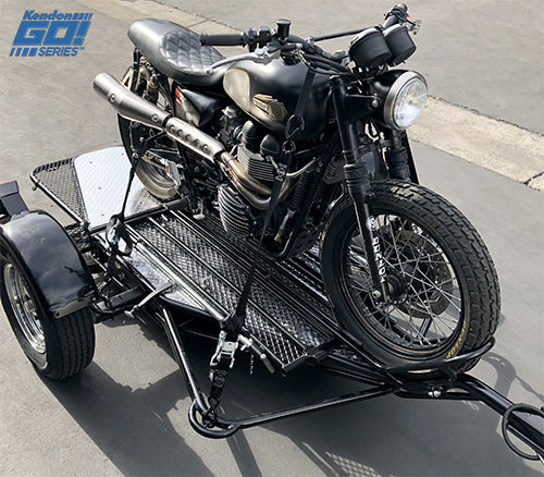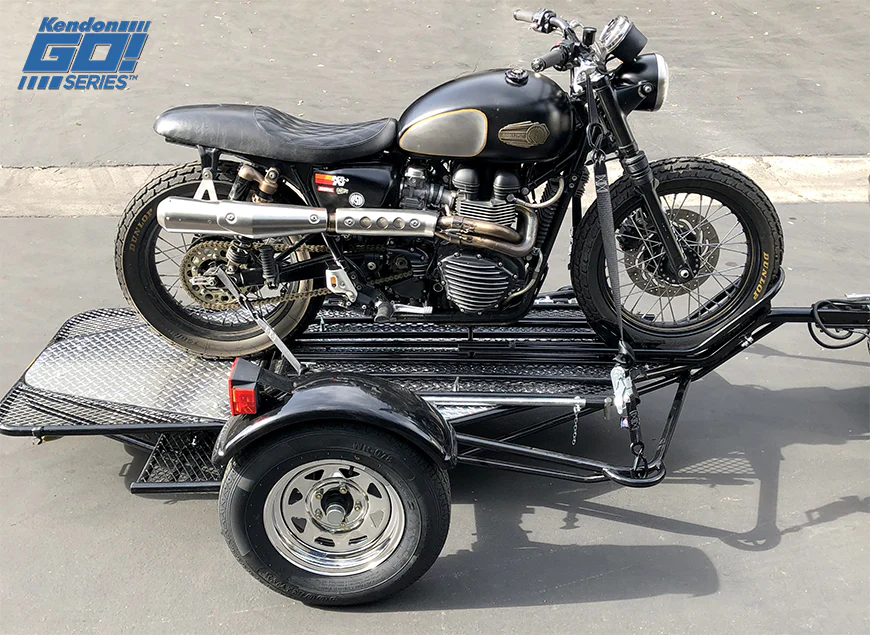 Similar to it’s older brother, our hand-crafted Single Ride-Up SRL Trailer, the Go! Series Single bike trailer features durable light-weight frame geometry and suspension design that allows you to ride your motorcycle onto the trailer. The ride-on operation makes it much easier to load a heavy, full-size bike. As you ride your bike onto the trailer the integrated extensions and wider ramps allow you to put your feet down to safely load and unload your motorcycle. Once the bike is loaded, the Kendon classic rail and motorcycle wheel chock system keeps your bike upright so you can strap down for safe and effortless towing.