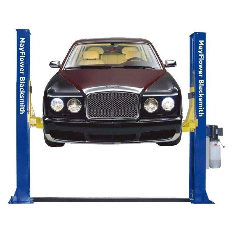 The Mayflower Blacksmith Two Post Lift Floor Plate BP is a heavy-duty lift designed for automotive service and repair shops. It has a lifting capacity of 9500 lbs, making it suitable for a wide range of vehicles.